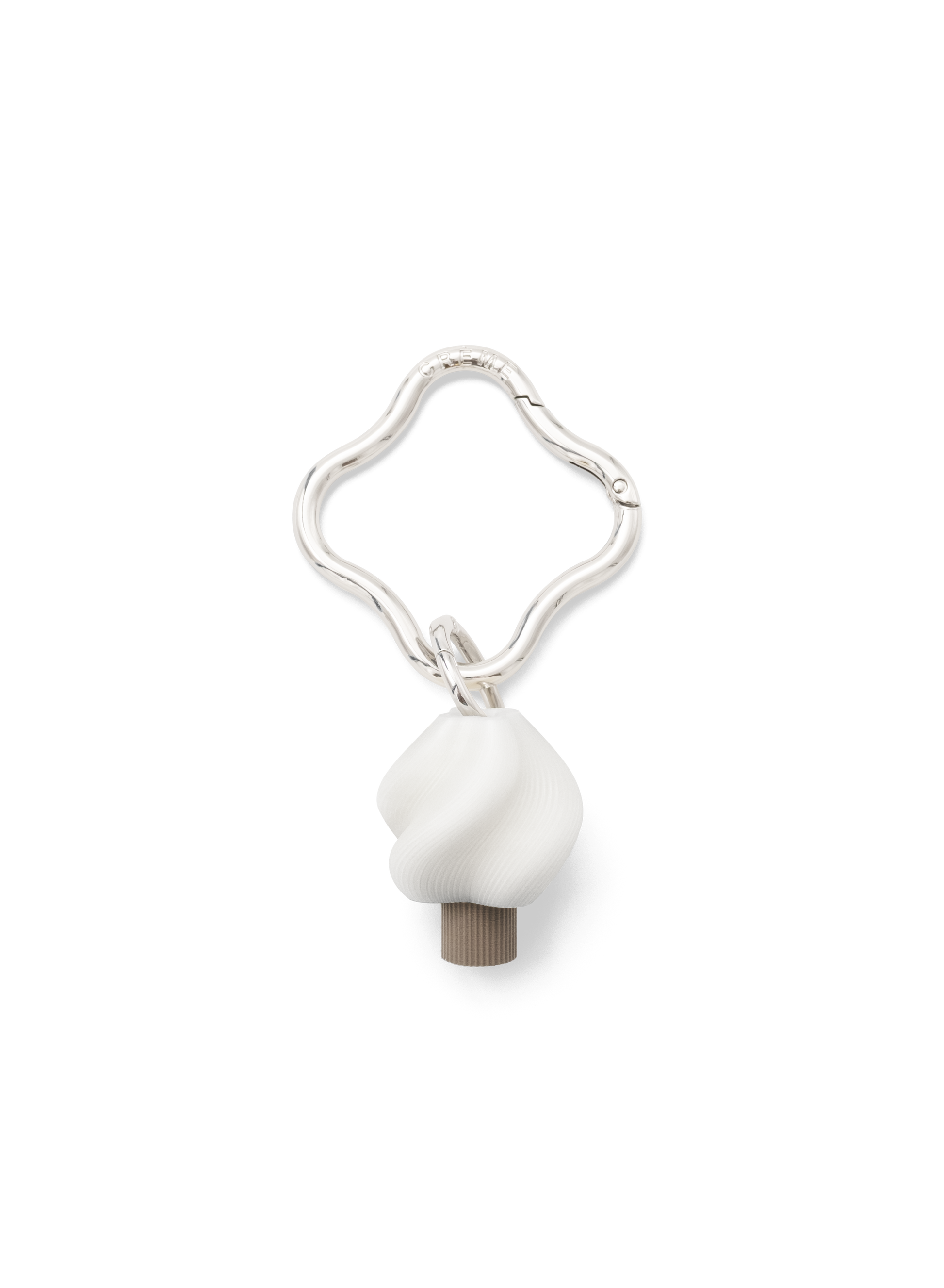 Turning our signature swirl into a charm. Each piece is 3D-printed to order in our Stockholm studio from recycled PLA. Including a flower shaped metal carabiner with silver gloss finish engraved with the CRÈME logo.