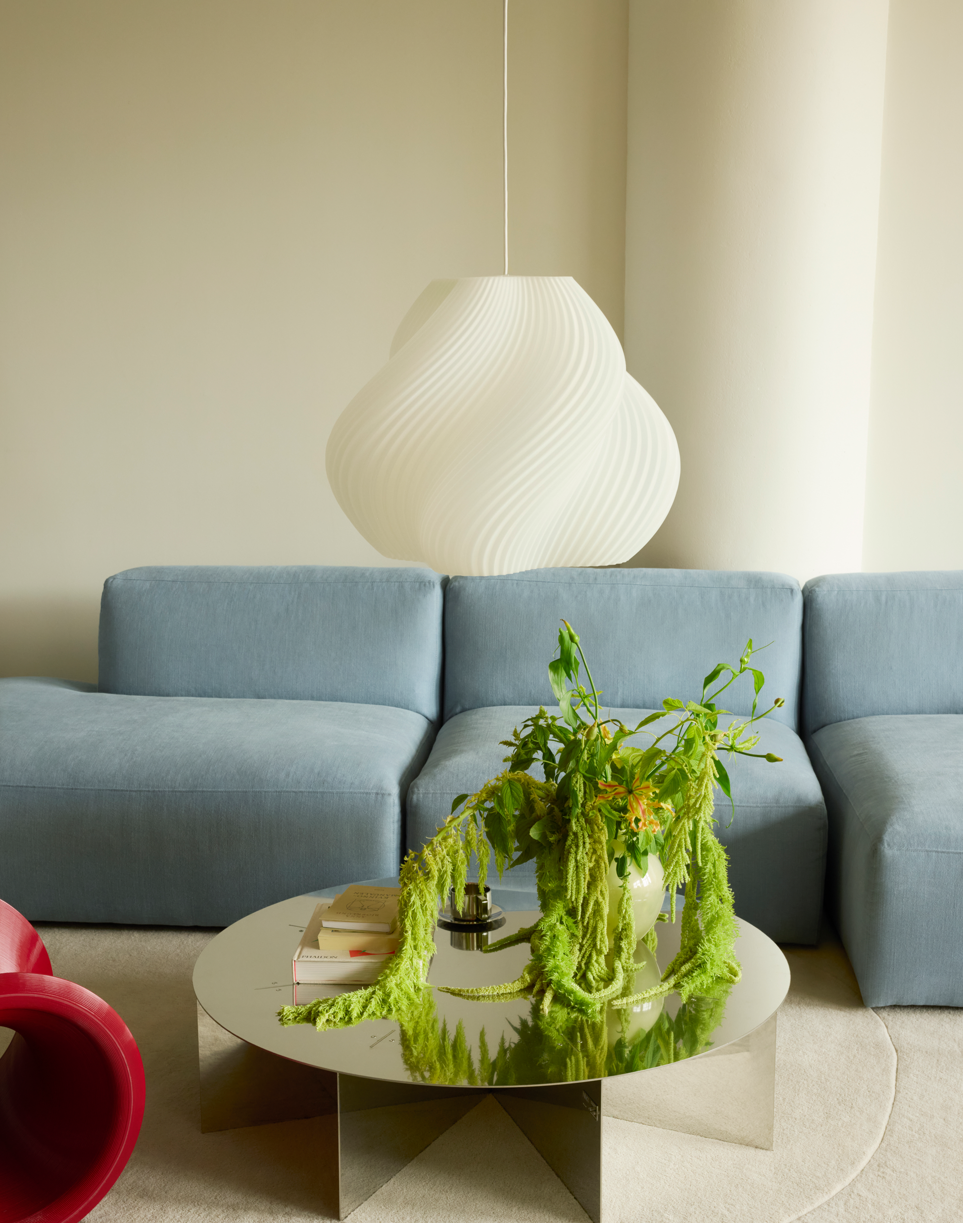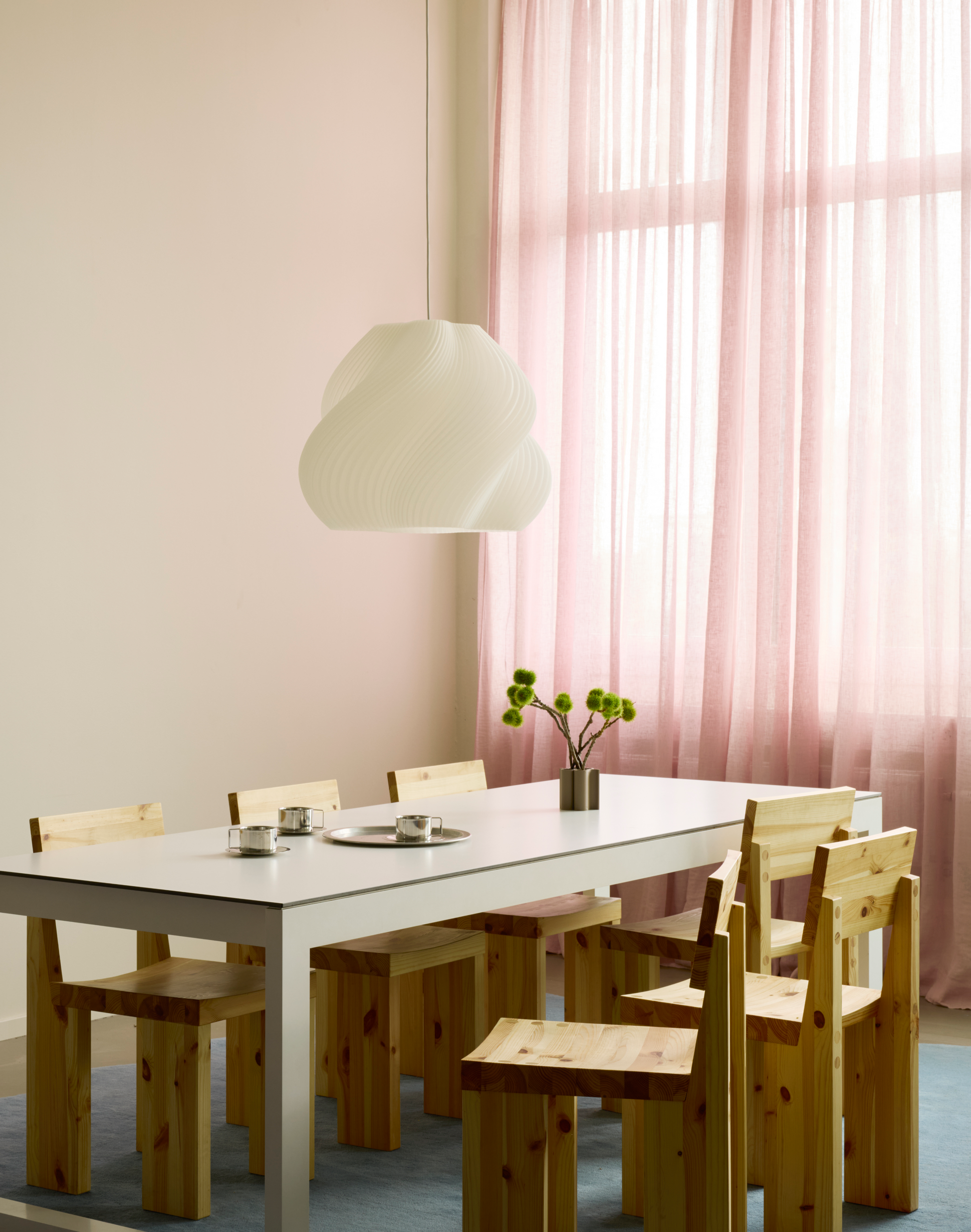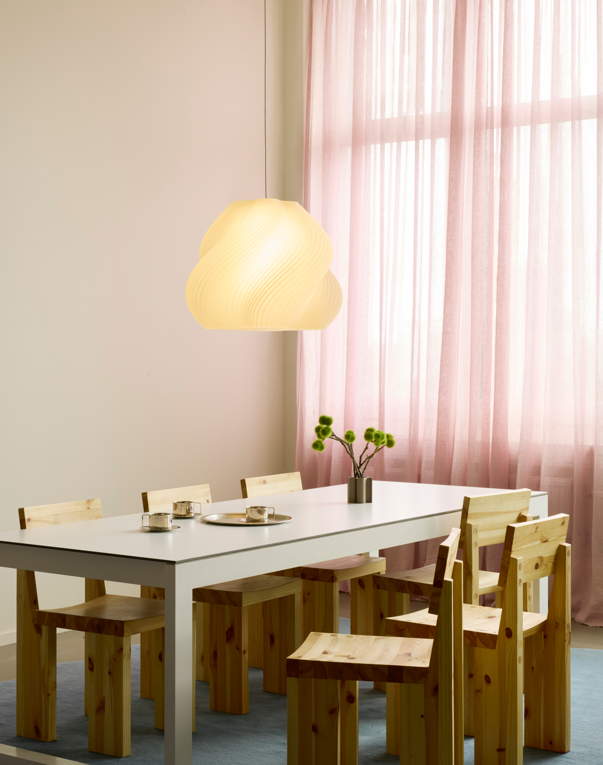 The Soft Serve Pendant Mega magnifies our iconic Soft Serve form into an oversized ceiling light with real presence. Its dramatic scale and flowing texture turn the familiar swirl into a sculptural centrepiece, ideal for larger settings. Each pendant is suspended from a strong steel wire with matching cable, giving a light, floating impression regardless